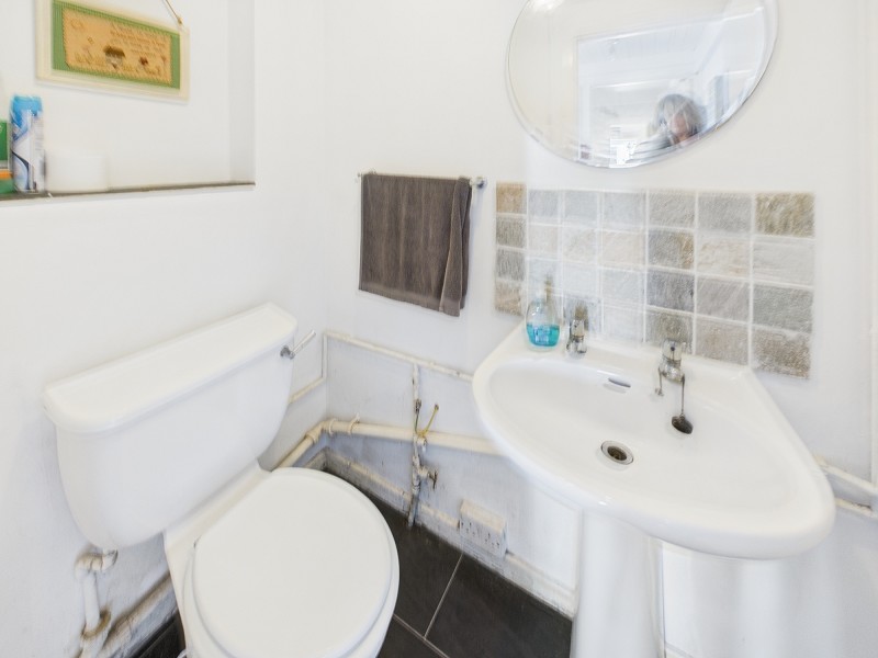 Downstairs WC with white sanitary ware comprising of a low level wc , wash hand basin and gas radiator.